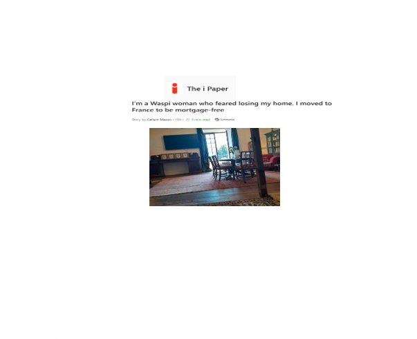 The article reports on the story of Sarah Olney Ross. Sarah is a WASPI women who feared her home would be repossessed and decided the only way forward was to sell her home and move to France. The move took place in 2016 and she is now receives her State Pension and finds the cosy of living in France much better than in the UK.