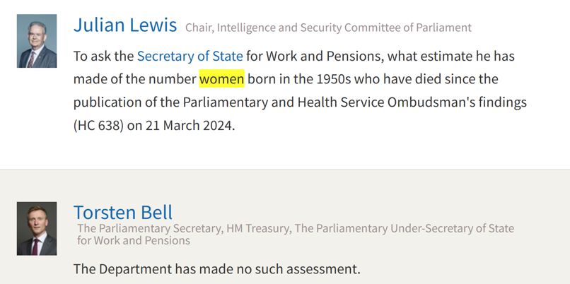 Julian Lewis MP askes a written question regarding the number of WASPI aged women who have died since the Ombudsman’s final report was made.. The rather terse response was made by Torsten Bell, the Parliamentary Under-Secretary of State for Work and Pensions.
